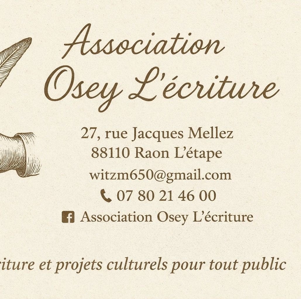Osey L’Écriture se présente comme une association culturelle dédiée à la pratique et à la promotion de l’écriture sous toutes ses formes. L’association vise à encourager l’expression personnelle par l’écrit, à développer la créativité et la confiance en soi, et à favoriser le lien social à travers des projets collectifs. Elle souhaite développer des partenariats locaux, avec des interventions possibles dans des structures comme les médiathèques, établissements scolaires, centres sociaux ou EHPAD.