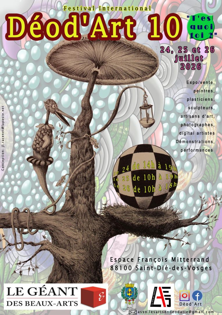 À près de 6 mois de l’ouverture du 10e Déod’Art, Les Arts en Déodatie, l’association organisatrice, vient de dévoiler l’affiche du festival. Une affiche réalisée par l’artiste Jean-Luc Racenet, qui est à découvrir ci-dessous :