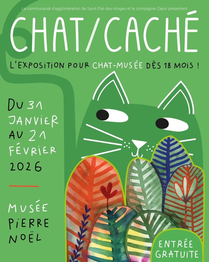 Prolongement du spectacle Chat/chat, qui a été récemment présenté à La Nef devant plus de 600 personnes, Chat/caché a été imaginée par la compagnie Zapoï de Valenciennes, à partir des illustrations de l’artiste Magali Dulain. Le projet s’inscrit dans le cadre du Contrat Territorial d’Éducation Artistique et Culturelle – CTEAC – de l’Agglomération de Saint-Dié-des-Vosges, en lien avec l’équipe du musée Pierre-Noël.