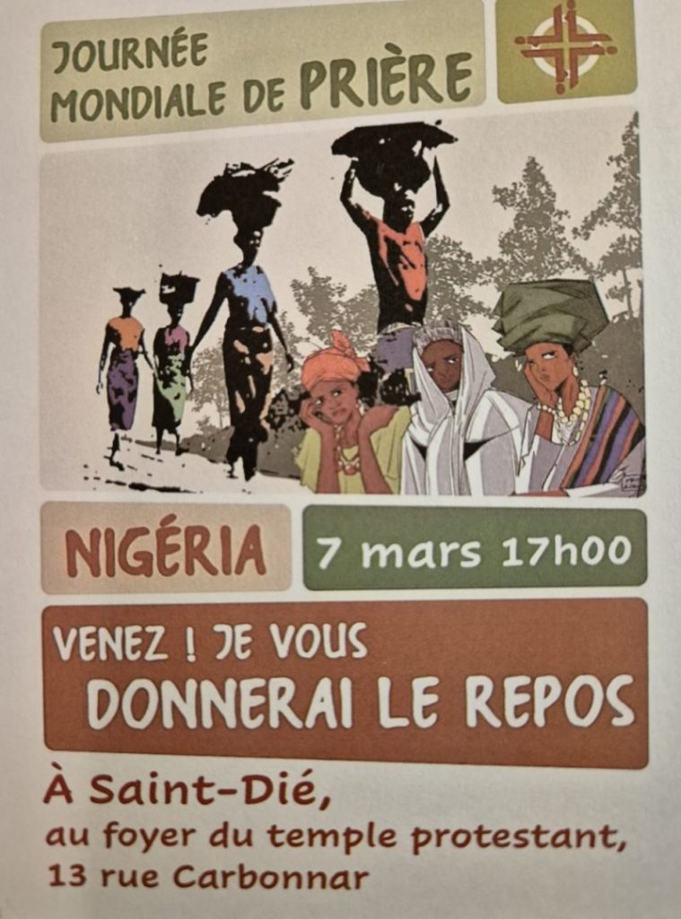 La Journée Mondiale de Prière sera célébrée le samedi 7 mars à Saint-Dié-des-Vosges, à partir de 17 heures au Foyer Protestant (13 rue Carbonnar). Ce temps de prière s’inscrit dans un mouvement œcuménique porté depuis plus d’un siècle par des femmes chrétiennes à travers le monde.