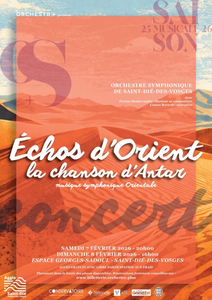 Ce week-end, l’association Orchestre+ propose deux concerts de l’Orchestre Symphonique de Saint-Dié-des-Vosges autour de « Échos d’Orient – La Chanson d’Antar » à l’Espace Georges-Sadoul, samedi 7 février à 20 h et dimanche 8 février à 16 h.