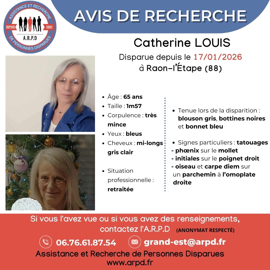 L’A.R.P.D invite toute personne ayant vu Catherine Louis ou disposant du moindre renseignement à prendre contact avec ses enquêteurs. Il est possible de joindre l’association au 06-76-61-87-54 ou par courriel à grand-est@arpd.fr. L’anonymat des témoins est garanti.
