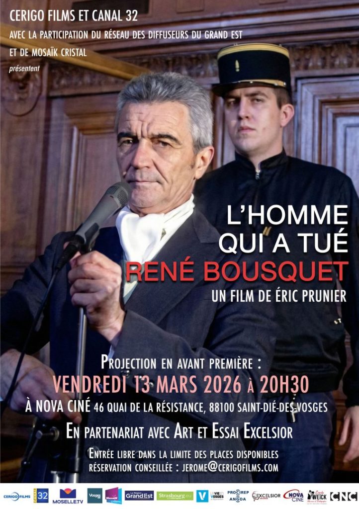 Nova Ciné accueillera, vendredi 13 mars à 20 h 30, une projection en avant-première du film L’homme qui a tué René Bousquet, réalisé par Éric Prunier. Tourné à Saint-Dié-des-Vosges, ce long-métrage revient sur l’assassinat, le 8 juin 1993, de René Bousquet par Christian Didier.