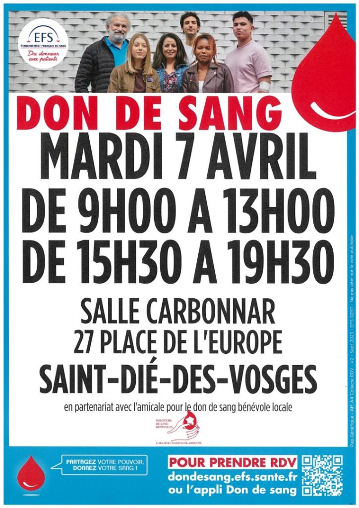 La prochaine collecte de sang organisée à Saint-Dié-des-Vosges par l’Établissement Français du Sang – EFS – Grand Est, avec le soutien de l’amicale locale des Donneurs de Sang bénévoles, aura lieu le mardi 7 avril, de 9h à 13h puis de 15h30 à 19h30 à la salle Carbonnar (27, place de l’Europe).