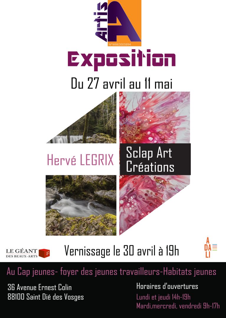 L’exposition collective réunissant Hervé Legrix et Sandra Pierrel se tiendra au Foyer des Jeunes Travailleurs (36 avenue Ernest-Colin, à Saint-Dié-des-Vosges), du 27 avril au 11 mai. Le lieu sera ouvert le lundi et le jeudi de 14 h à 19 h, ainsi que le mardi, le mercredi et le vendredi de 9 h à 17 h. Le vernissage aura lieu le 30 avril à 19 h.