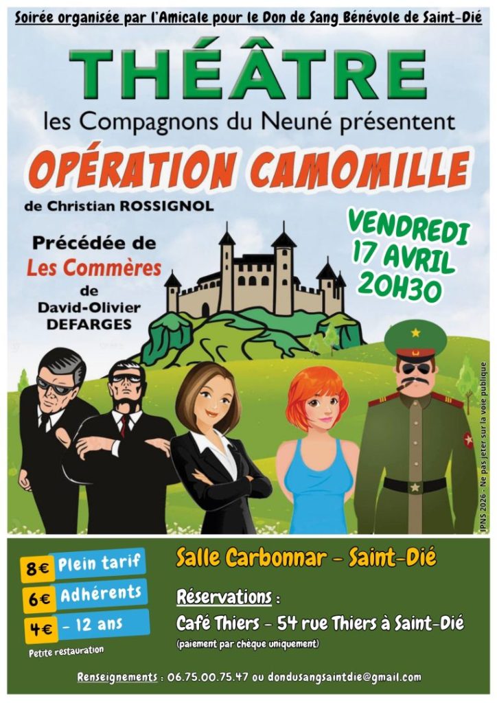 Pour cette soirée, la troupe Les Compagnons du Neuné, de Corcieux, interprétera la comédie « Opération camomille » de Christian Rossignol. La représentation sera précédée de « Les Commères » de David-Olivier Defarges.