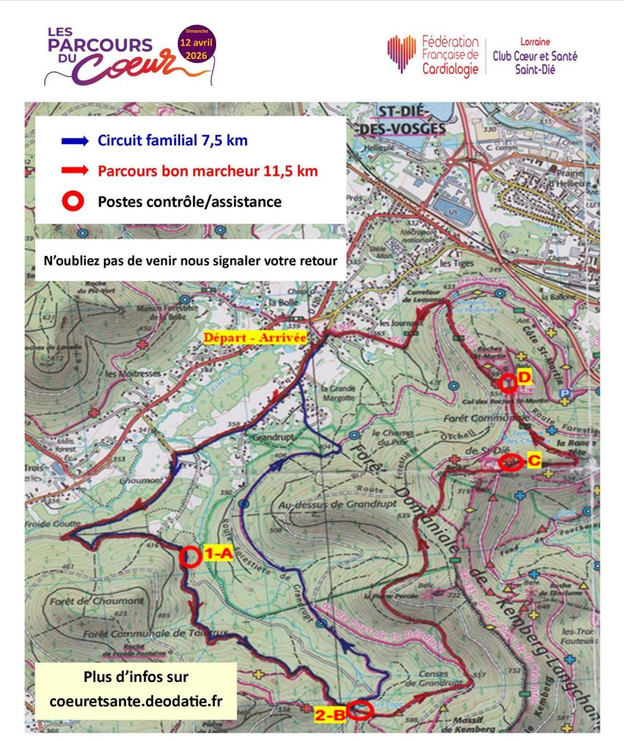 Les Parcours du Coeur, organisés par la Fédération française de cardiologie – FFC –, se dérouleront du 1er avril au 30 juin en France. À Saint-Dié-des-Vosges, c’est dans ce cadre que deux rendez-vous sont organisés en avril par le Club Coeur et Santé : le jeudi 2 pour les scolaires et le dimanche 12 pour le grand public.