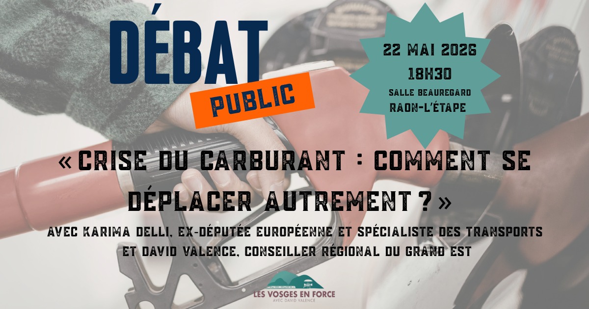 Un débat public consacré aux mobilités face à la hausse du coût des carburants se tiendra vendredi 22 mai, à 18 h 30, salle Beauregard (Raon-l’Étape). Organisée par « Les Vosges en Force avec David Valence », la rencontre portera sur le thème : « Face à la crise du carburant, comment se déplacer autrement ? ».