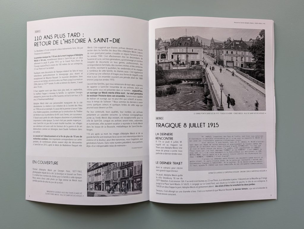 Ce sixième numéro revient d’abord sur les circonstances de la mort d’Adolphe Weick, touché par un obus allemand le 8 juillet, en 1915, alors qu’il se rendait à sa boutique du 23 rue Thiers. Blessé au Grand Pont – l’actuel pont de la République – à moins de 100 mètres de son entreprise, il est mort dans la soirée à l’hôpital déodatien. Il avait 54 ans. Le Révélateur s’appuie notamment sur le témoignage de Maurice Roussel, musicien déodatien qui avait 10 ans au moment du drame.