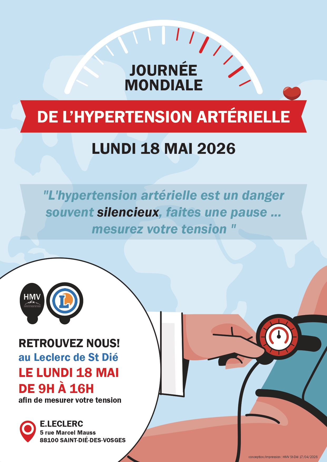 Une journée gratuite de dépistage de l’hypertension artérielle se tiendra lundi 18 mai, de 9 h à 16 h, au magasin E. Leclerc de Saint-Dié-des-Vosges. Ouverte à tous, elle mobilisera des professionnels de santé du Centre Hospitalier déodatien afin de sensibiliser le public à cette maladie souvent silencieuse, dont les conséquences peuvent être graves lorsqu’elle n’est pas prise en charge.