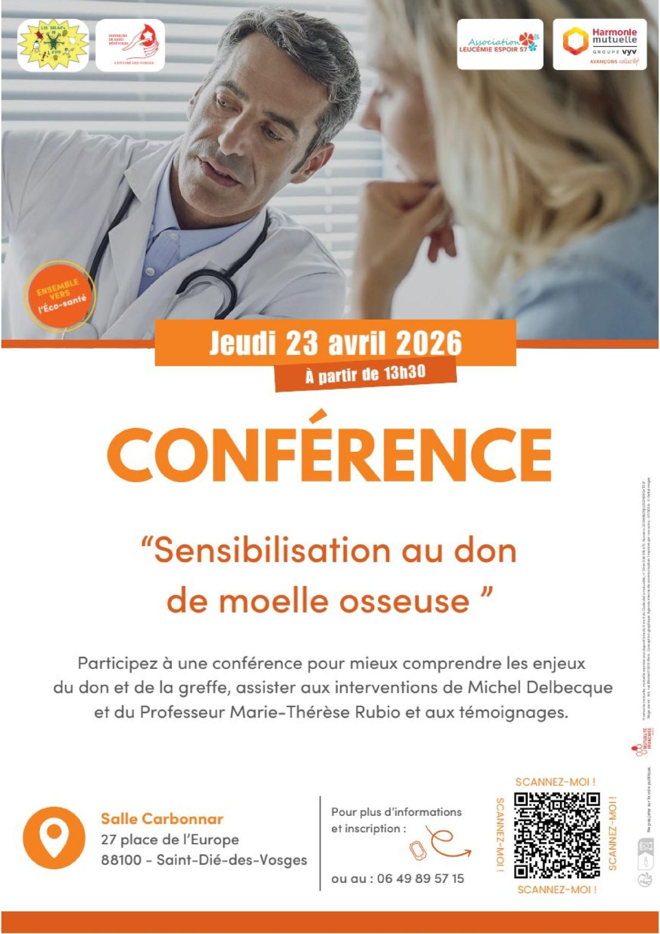 Cette action de sensibilisation prendra la forme d’une conférence destinée à mieux faire comprendre les questions liées au don de moelle osseuse et à la greffe. Des interventions de Michel Delbecque et du professeur Marie-Thérèse Rubio, hématologue au CHU de Brabois, sont prévues, ainsi que des témoignages de personnes greffées.