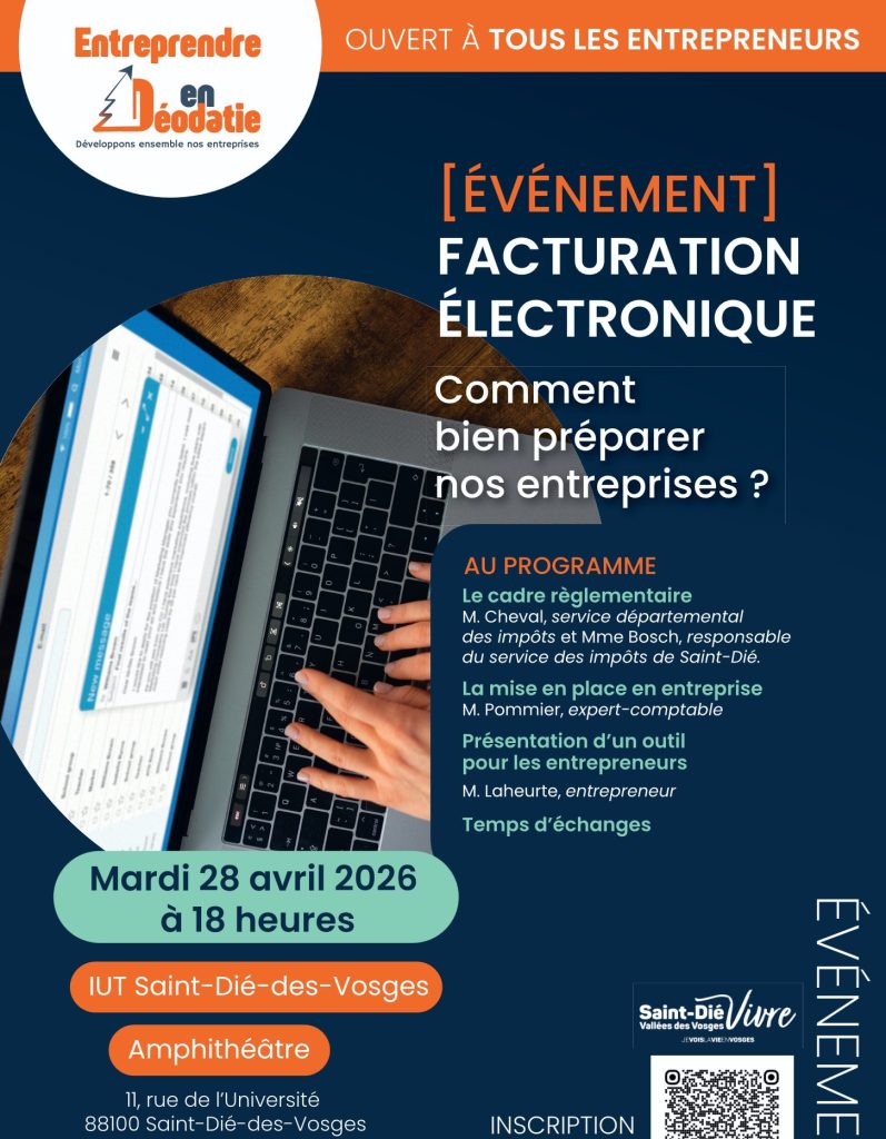 Mardi 28 avril, à 18 heures, l’association Entreprendre en Déodatie proposera à l’amphithéâtre de l’IUT Saint-Dié-des-Vosges (11, rue de l’Université) une soirée d’information consacrée à la facturation électronique. Ouvert gratuitement à tous les entrepreneurs, ce rendez-vous doit aider les entreprises à se préparer à une réforme qui se mettra en place progressivement d’ici 2027.